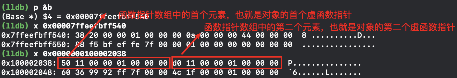 通过 p b 命令可以查看到对象内存结构中有两个成员变量,并且已经被赋值,除了这两个成员变量外,前面还有一个 Base 的虚函数指针,使用 info vtbl b 命令可以看到这个虚函数指针指向的内存空间是一个数组,数组中有一个元素,这个元素就是对象的 test() 虚函数指针。
